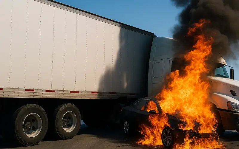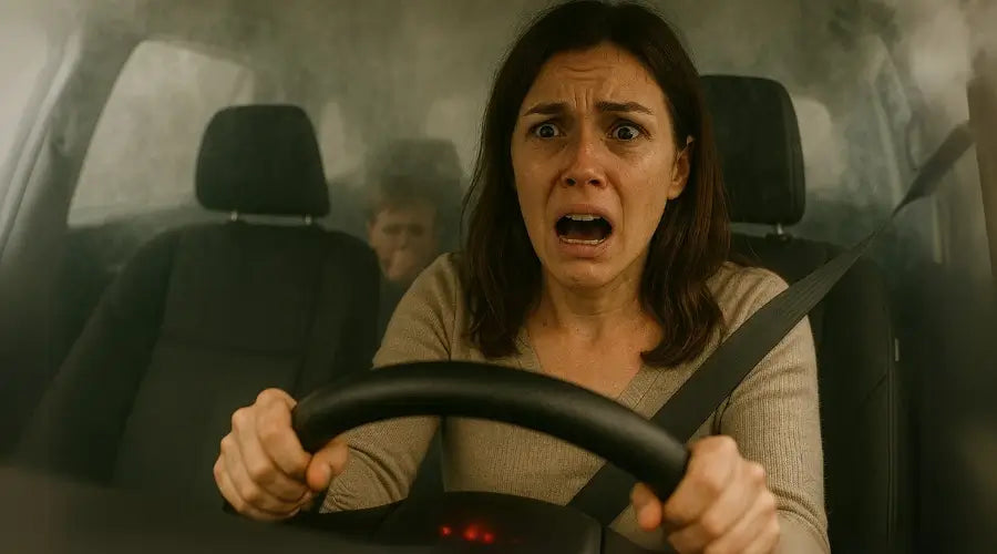 Fumul umple interiorul. Mai sunt doar câteva secunde înainte ca mașina să fie cuprinsă de flăcări.